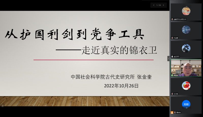 2022年10月26日下午15:00—17:30,华东师范大学百场校级学术讲座第41场曁“大夏中国史论坛2022年前沿讲座”第2讲,邀请到中国社会科学院历史研究所明史研究室研究员、中国明史学会副会长张金奎老师,进行题为“从护国利剑到党争工具——走进真实的锦衣卫”讲座。华东师范大学det365在线副教授黄阿明主持此次活动,华东师范大学det365在线副教授包诗卿作为与谈人,来自华东师范大学、复旦大学、中国社会科学院大学等校内外数百余位师生通过腾讯会议在线参加此次讲座。