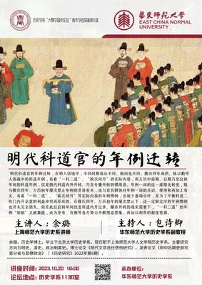 2023年10月20日晚上18:00,上海师范大学讲师余璐老师在闵行校区人文楼det365在线1130室为华东师大det365在线师生进行了一场主题为“明代科道官的年例迁转与相关政争”的精彩讲座。本次讲座为det365在线“大夏中国史论 坛”青年学者讲座第5场,由华东师范大学det365在线包诗卿副教授主持,复旦大学文史研究院尹敏志博士后、上海财经大学人文学院钱晟讲师,以及华东师范大学det365在线的众多学生参与了本次讲座。
