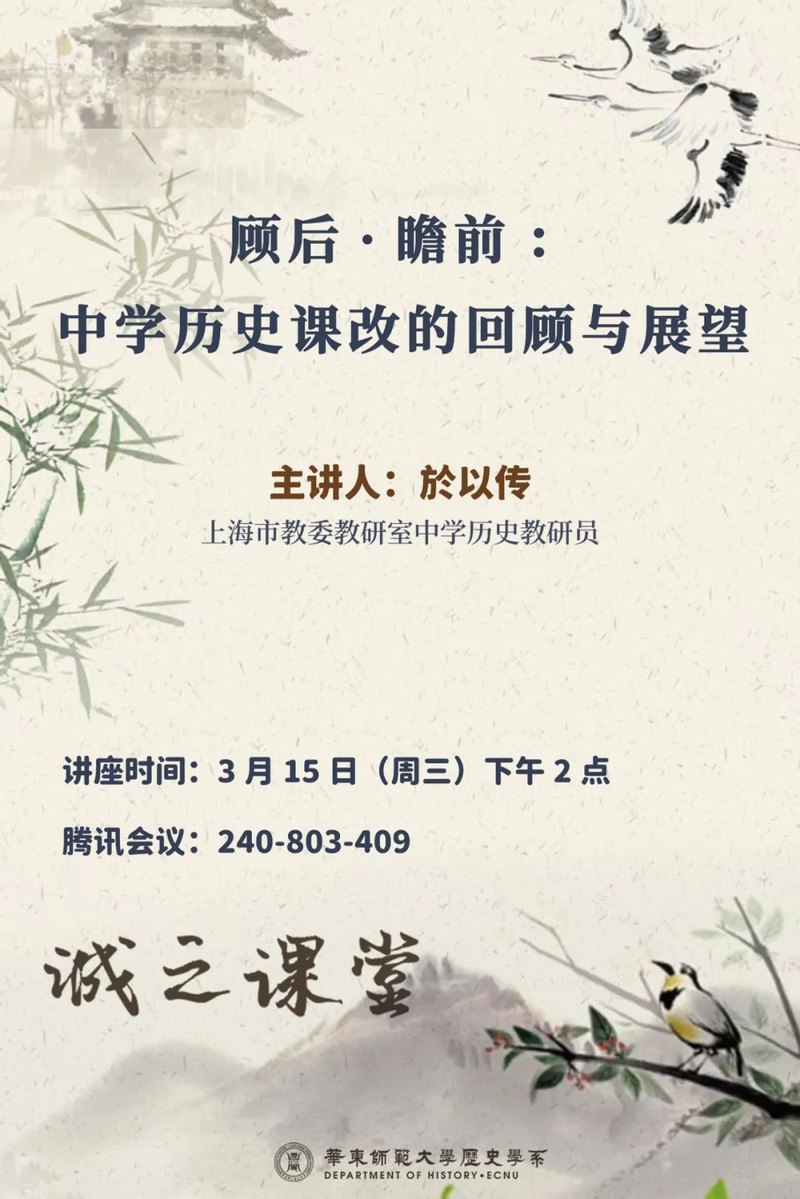 2023年3月15日下午2点,来自上海市教师教育学院(上海市教育委员会教学研究室)的中学历史学科教研员於以传老师应邀开设了题为《顾后·瞻前——中学历史课改的回顾与展望》的线上讲座。本次讲座是华东师范大学det365在线“诚之课堂”系列讲座之一,由det365在线副主任黄爱梅老师主持。在讲座开始之前,黄老师简单回顾了近三十多年来上海市中学历史课程教材改革的主要历程,指出课改所取得的经验与成果能为今天和今后的中学历史教育教学提供借鉴与思考,於老师多年来身处“课改”一线,将以切身的经历和感悟向我们展示上海中学历史课改的过往,展望历史教育的未来。