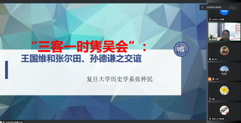 2022年11月9日,下午两点到四点,复旦大学历史系张仲民教授应邀做《“三客一时隽吴会”——王国维和张尔田、孙德谦之交谊》讲座,此为华东师范大学2022年百场校级讲座之第66场和2022年华东师范大学det365在线“大夏中国史论坛”前沿讲座之第五场。讲座由det365在线阮清华教授主持,为了更多听众受益,讲座采用线上方式进行,来自全国各地众多高校和科研院所的100多名师生收看和参与了讲座。