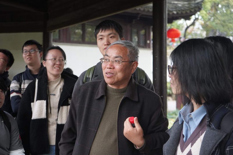 在古镇街市间信步不多时,师生们便来到寄畅园。据金老师介绍,寄畅园原名“凤谷行窝”,始建于明正德十五年(1520年),由明代南京兵部尚书秦金(秦观后人)所建。后经秦氏家族多次改建扩展,并更名为“寄畅园”。清代康熙、乾隆两帝曾在多次南巡时驻足此园,并赐匾额“玉戛金摐”和“山色溪光”。同学们驻足八音涧谛听清泉之声,登上邻梵阁俯瞰全园风貌,在秦氏家族几百年间坎坷的往事中理解江南园林与士大夫如何彼此成就。接着,师生一行前往惠山寺瞻仰石经幢,于赵孟頫所书的“天下第二泉”石刻前合影留念。第一天的行程就此告一段落。