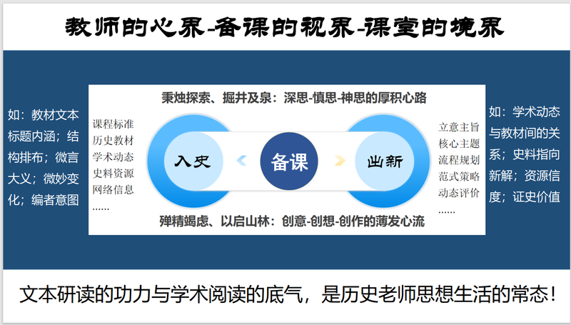 李老师首先强调了备课的重要性。李老师认为备课是教学的起点,是教师综合功力的合成。备课是在博观基础上的约取、在科学基础上的隽永、在逻辑基础上的意蕴。课程标准是基于国家意志的顶层设计,教科书基于课程标准撰写而成,而教师应当以教科书与课程标准作为知识原点,向外辐射,进行史学阅读,从而完成备课的灵感和逻辑的扣合。