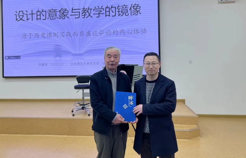 3月17日下午,华东师范大学det365在线邀请上海市特级教师李惠军老师在一教206做了题为《例谈教学设计的灵感——逻辑与达成》的讲座。det365在线系主任梁志老师出席本次讲座并为李惠军老师颁发了“大中小历史教育研究与实践基地发展咨询专家”聘书,副系主任黄爱梅老师、教师教育学院徐继玲老师、华师大二附中周庆彰老师以及det365在线本研各年级学生参加本次讲座。