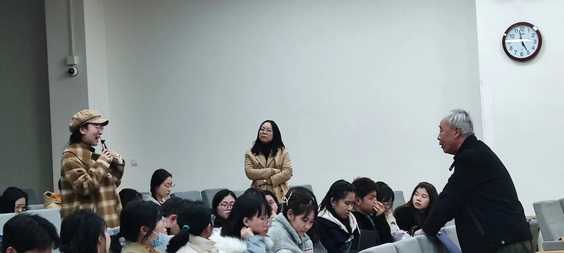 讲座的最后,我系本硕同学争相向李老师提问,李老师一一予以解答,并对同学们的热情予以鼓励。会后,华二附中周庆彰老师这样总结自己的感想:“其一,心中有爱,则所见万物都能转化为教学资源;其二,学会读懂教材语言背后的留白;其三,学生爱听永远是一节好课的共同标准。”这也是参加本次讲座全体师生的共同感受。无论线下整间教室里听讲的学生,还是线上四百多名听众,无一不被李惠军老师对教学研究的热爱和讲台上的激情所感染,正如某位同学朋友圈里所抒发的:眼里又有光了!