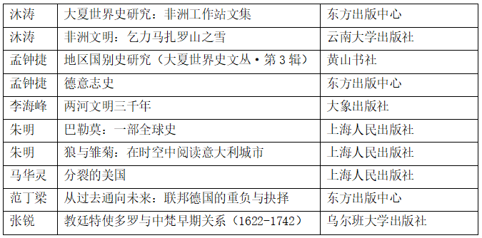 在科学研究方面,世界史学科在2022年出版专著、编著和译著等10部(详见下表)。孟钟捷教授领衔的《外国历史教科书中的中国形象史料整理与研究》和梁志教授领衔的《美国对朝鲜半岛政策档案文献整理与研究(1945—2001)》均获得国家社科基金重大项目立项。