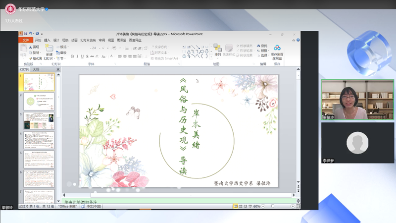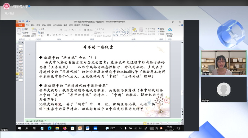 2023年3月24日下午14:00——15:30,华东师范大学“卓越讲坛·史学论文写作讲座”在人文楼5303顺利举办。暨南大学文学院历史系副教授梁敏玲老师带来岸本美绪教授《风俗与历史观:明清时代的中国与世界》的导读,华东师大det365在线教授、“思勉班”导师李文杰老师主持此次活动。本讲座为华东师范大学第11期卓越讲坛系列活动的第四场,累计超过1万人次线上线下观看。