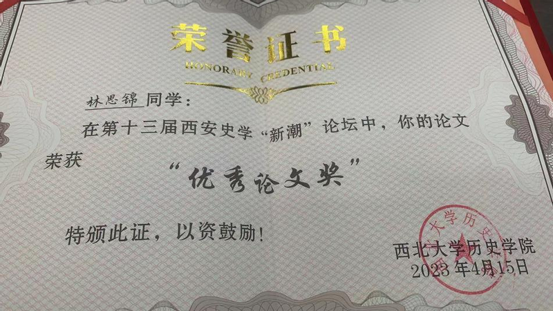在日前举行的第十三届西安史学“新潮”论坛上,我系2020级历史学师范班本科生林思锦的《“把军将死”:邓小平对苏决策研究(1978—1982)》荣获“优秀论文奖”。论文的指导教师为我系郝江东副教授。