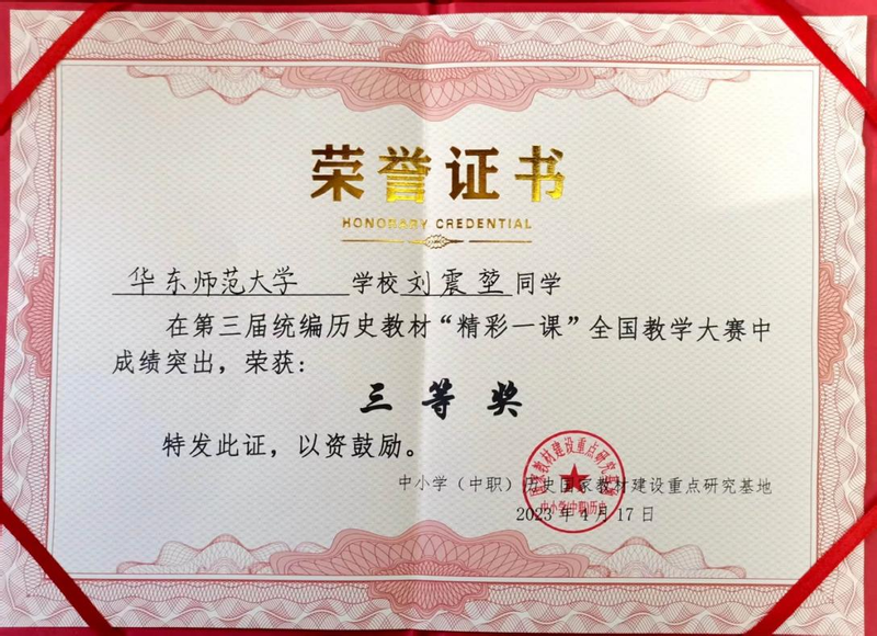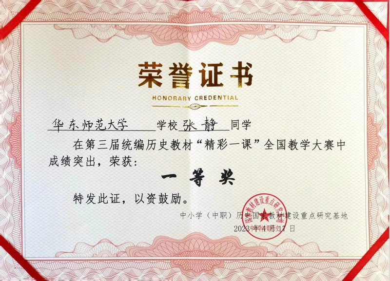 在第三届统编历史教材“精彩一课”全国教学大赛中,张静同学获一等奖、刘震堃同学获三等奖。