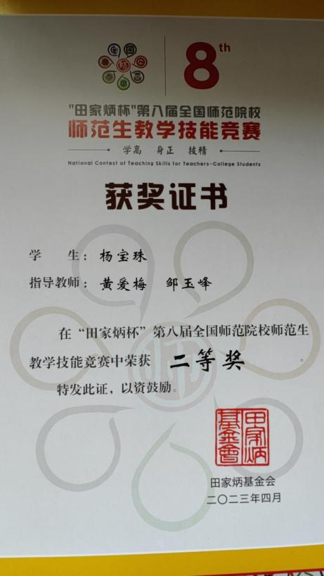 在“田家炳杯”第八届全国师范院校师范生教学技能竞赛中,杨宝珠同学获二等奖,指导老师为黄爱梅老师、邹玉峰老师。