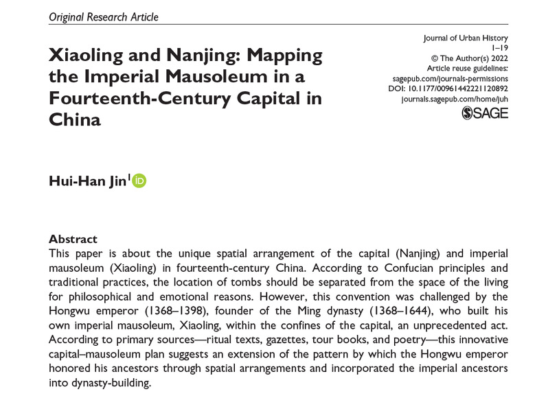 Xiaoling and Nanjing: Mapping the Imperial Mausoleum in a Fourteenth-Century Capital in China (孝陵与南京:位于中国十四世纪都城中的帝陵)。发表于 Journal of Urban History (ISSN: 0096-1442), September 8, 2022, DOI:10.1177/00961442221120892 (Online first)。