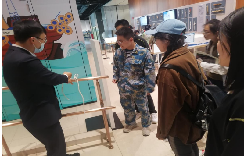 王老师还为项目成员展示了博物馆以科普为目的设计的多种资源。水手绳结,是千年航海文化的重要载体,兼具实用性与艺术性,这项水手必备技能的讲解和示范是科普课程引入的极佳选择。“中海博”联合周边高校组成旗语队,融合展板介绍与亲身体验,增加科普活动的趣味性。除此以外,王老师还展示了辅助科普活动的航海徽章、船舶模型、粘土玩具和知识读本。这一方面为成员们的线下宣讲提供丰富的物料支持,另一方面也启示同学们重视课程的吸引力和互动效果。