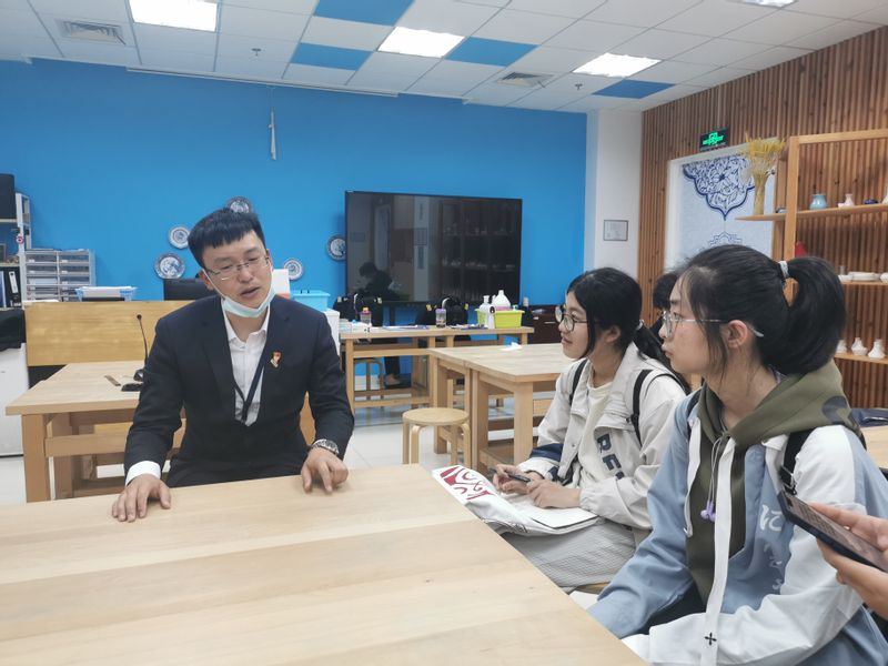 体验结束后,项目成员代表与两位老师就参观经历和感受进行交流。王老师依据手工物料与馆内展品,对科普课程的主题选择提出建议,在切入点和趣味性方面进行优化。他以航海传统习俗这一科普课程举例,描述了古代船饰含义、船舶禁忌语言等重点内容,直观形象地让成员们体会到主题设计的关键之处。
