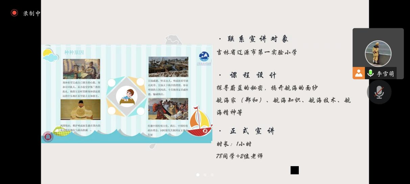 4月19日下午,项目成员与指导老师开展线上交流。五个小组的代表分别汇报了项目自寒假以来的实践过程与收获成果,同学们在吉林、湖北、广西等多地进行宣讲活动,形成了各具特色的航海文化科普课程。王灵林、蔡慧贤老师均对成员们在寒假付出的努力与形成的成果表示肯定,并鼓励同学们继续保持对志愿服务认真专注的态度与真挚饱满的热情,为暑假线下科普实践做好前期准备工作。