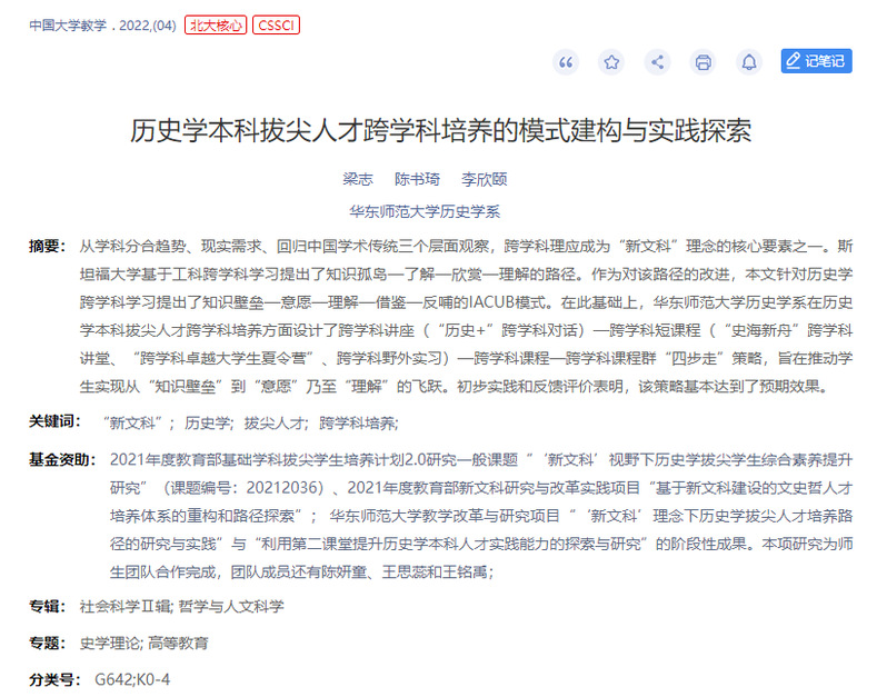 梁志教授指导的“历史学拔尖学生培养的跨学科路径探索”项目成果之一发表于《中国大学教学》(2022年第4期),题目为《历史学本科拔尖人才跨学科培养的模式建构与实践探索》,参与同学为陈书琦、李欣颐。项目成果之二发表于教育部内刊《拔尖通讯》(2021年第四期),题目为《IACUB模式:历史学本科拔尖人才跨学科培养路径探索》,参与同学为王铭禹、王思蕊、陈妍童、陈书琦、李欣颐。