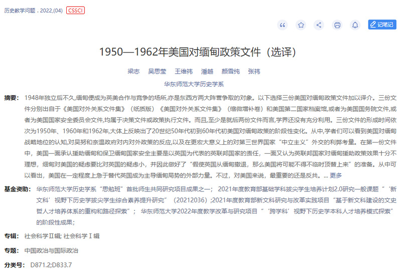 梁志教授指导的“20世纪50年代美缅关系档案译介”项目成果发表于CSSCI期刊《历史教学问题》(2022年第4期),题目为《1950-1962年美国对缅甸政策文件(选译)》,参与同学为吴思莹、王维祎、潘越、颜雪纯和张祎。