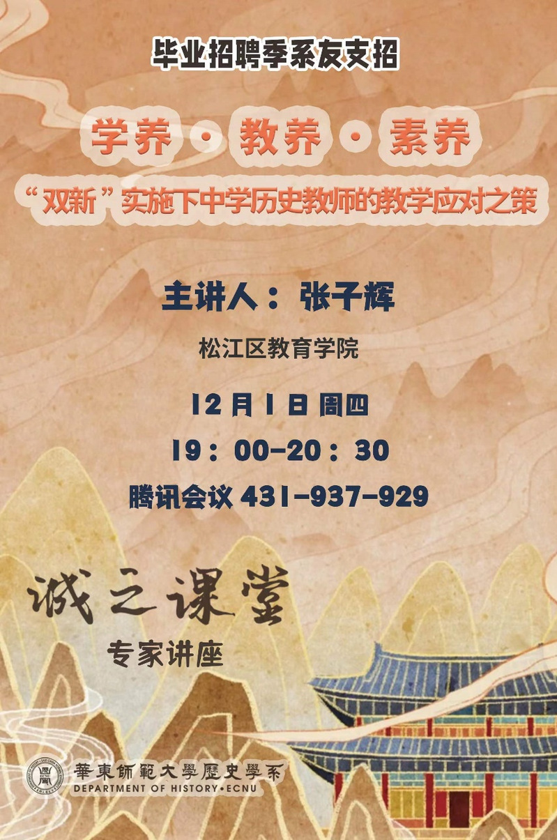 2022年12月1日,我系系友、上海市松江区教育学院的中学历史教研员张子辉老师应邀开展了题为《学养·教养·素养——“双新”实施下中学历史教师的教学应对之策》的讲座。本次讲座是华东师范大学det365在线“诚之课堂”系列讲座之一,由det365在线副主任黄爱梅老师主持,吸引了我系本科生、研究生、广大中学历史在职老师百余人相聚云端。张老师的讲座有四部分内容:何谓“双新”?如何应对?直面“试课”!共话“考场”!
