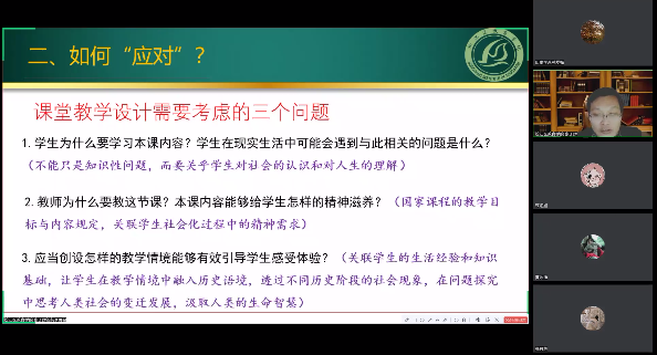 张老师指出,教师应当树立新的认知观、教学观和评价观念,实现基于历史学科核心素养的教学。