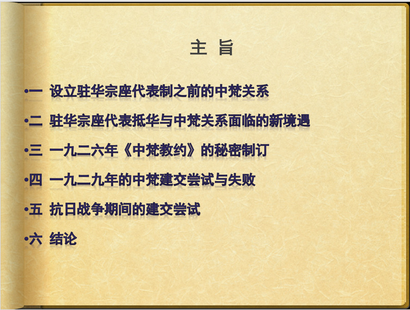 刘国鹏老师首先回顾了刚恒毅来华前的历史背景,讲述了设立驻华宗座代表制之前的中梵关系。清末民初,中国与罗马教廷曾两次尝试建立外交关系,一次发生在19世纪末,当时的清政府旨在削弱法国在华的保教权;另一次则发生在民国初期,中梵在“一战”后期曾多次谈判,但历史上的这两次交涉均无果而终。