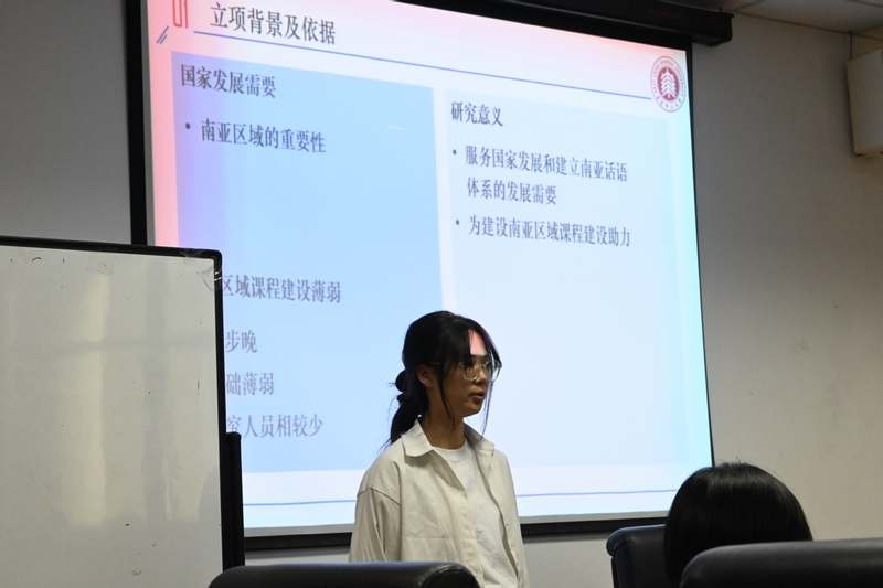 第八组进行报告的是黄羽彤团队,课题为《以学生视角推进的南亚区域课程建设》。该课题希望在我国面临日渐复杂国际形势的当下,以学生视角切入,对当下我国高校南亚史研究课程体系进行调研和分析,并最终促成新型南亚史课程的开设和推广。对此,谷继坤老师认为该课题能够成为国内高校开设南亚史课程的参考,主要意义在于教师技能的训练;刘亚娟老师向报告人询问对国内高校南亚史研究的了解,报告人给出了回答。