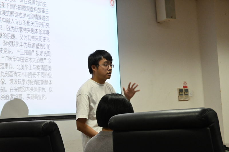 会议的第二部分是创业训练培育项目初审汇报。进行报告的是温宇涵团队,课题为《日出月落:以晚清为背景的系列剧本杀创作》。团队成员分析了近年来大火的“剧本杀”游戏模式,希望在晚清的历史框架下,以具体的历史故事为蓝本进行改编,创作系列“剧本杀”游戏,将历史的学科特点融入游戏体验中,寓教于乐,并寻求机会进行剧本的商业化。三位老师对此产生了浓厚兴趣;黄阿明老师指出目前团队人员组成仍欠缺,应继续跨专业寻找合作伙伴形成体量更大的游戏设计团队;谷继坤老师认为该项目可以从微观视角创作层面提升趣味性,对此报告人表示可以设计成开放式结局;刘亚娟老师在此基础上总结启发了历史系学生面对的就业问题,鼓励同学们开拓视野,在坚守本位的同时也要不断推陈出新,挑战自我。