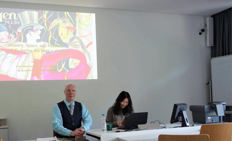 任小奇汇报了论文的选题源起、研究现状、论文框架以及还需进一步思考的问题。乌发(Universum Film AG)既是德国的电影公司,又是德国从一战到二战的历史缩影,从全球角度看它还是上世纪二三十年代联系德国与中国的文化交流的纽带。此外,电影作为一种新媒介的出现,其社会意义不仅在于影片内容对社会的反映与影响,更在于电影这种媒介形式本身对现代性的助推。现场的师生对上世纪二三十年代乌发影片在中国的放映以及时人在报刊发表的电影评论十分感兴趣,并进一步对“文化误读”现象展开了讨论。文化误读并不是负面的,相反,误读恰恰是理解对方文化的密钥,这一现象值得深入对比研究。此外,舒曼博士(Dr. Jutta Schumann)与汇报人探讨了二三十年代的上海与柏林的相似性并思考其可能的原因。沃布林博士提议还需关考虑其他德国企业在上海的情况,在中德交往史的总体背景中考量。最后,报告在热烈的讨论中结束。